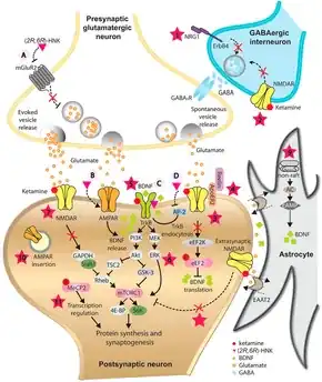 Ketamine is a rapid-acting antidepressant in depression.[16][60][61][62][63] It also may be effective in decreasing suicidal ideation, although based on lower quality evidence.[64][65][66] Benefits occur in about 15% of people at 1 to 4 weeks.[67] A single low, sub-anesthetic dose of ketamine given via intravenous infusion may produce antidepressant effects within four hours.[13] These antidepressant effects may persist for up to several weeks following a single infusion.[13][68] This is in contrast to conventional antidepressants like selective serotonin reuptake inhibitors (SSRIs) and tricyclic antidepressants (TCAs), which generally require at least several weeks for their benefits to occur and become maximal.[13] Moreover, based on the available preliminary evidence, the magnitude of the antidepressant effects of ketamine appears to be more than double that of conventional antidepressants.[13] On the basis of these findings, some have described ketamine as the single most important advance in the treatment of depression in over 50 years.[68][14] It has sparked interest in NMDA receptor antagonists for depression, and has shifted the direction of antidepressant research and development.[69]
