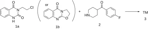 Either 3-(2-Chloroethyl)quinazoline-2,4(1H,3H)-dione [5081-87-8] (1a), or alternatively 2,3-dihydro-[1,3]oxazolo[2,3-b]quinazolin-5-one [52727-44-3] (1b) can be used as starting material. Attachment of the sidechain to 4-(4-Fluorobenzoyl)piperidine [56346-57-7] (2) completes the synthesis of Ketanserin (3).