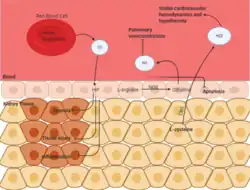 Carbon monoxide (CO) helps in stabilizing HIF, which helps in regulating autophagy and hypoxic response. Through this, inflammation and tissue injury are stabilized. Nitric Oxide (NO) is a byproduct of the metabolism of arginine to citrulline by NO synthase. This gas is available in all cells, and inhalation of NO has been found to be therapeutically active. This reduces pulmonary vasoconstriction and lessens apoptosis during renal ischemia. Hydrogen Sulfide (H2S) is also an endogenous product of metabolic activity in cells. This is a byproduct of the metabolism of cysteine by cystathionine-b-synthase. Like with NO, inhalation of H2S has been found to be therapeutic and has been shown to stabilize hypothermia and stabilize cardiovascular hemodynamics which protects from ischemic injury.[33]