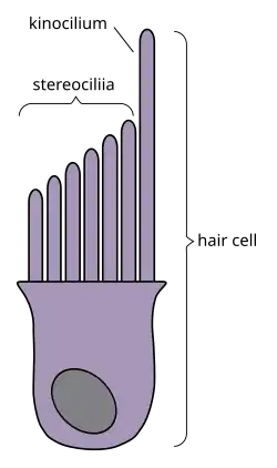 A kinocilium is a special type of cilium on the apex of hair cells located in the sensory epithelium of the vertebrate inner ear. Contrasting with stereocilia, which are numerous, there is only one kinocilium on each hair cell. The kinocilium can be identified by its apical position as well as its enlarged tip.[1]