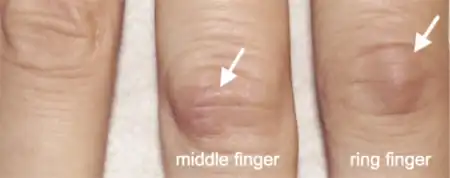 | Knuckle pads (arrows) over the PIP joints | |
