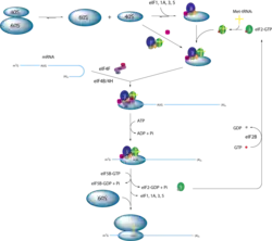 The scanning mechanism of Initiation starts when the PIC binds the 5′ end of the mRNA. Scanning is stimulated by Dhx29 and Ddx3/Ded1 and eIF4 proteins.[1] The Dhx29 and Ddx3/Ded1 are DEAD-box helicases that help to unwind any secondary mRNA structure which could hinder scanning.[17] The scanning of an mRNA continues until the first AUG codon on the mRNA is reached, this is known as the "First AUG Rule".[1] While exceptions to the "First AUG Rule" exist, most exceptions take place at a second AUG codon that is located 3 to 5 nucleotides downstream from the first AUG, or within 10 nucleotides from the 5′ end of the mRNA.[18] At the AUG codon a Methionine tRNA anticodon is recognized by mRNA codon.[19] Upon base pairing to the start codon the eIF5 in the PIC helps to hydrolyze a guanosine triphosphate (GTP) bound to the eIF2.[20][21] This leads to the a structural rearrangement that commits the PIC to binding to the large ribosomal subunit (60S) and forming the ribosomal complex (80S). Once the 80S ribosome complex is formed then the elongation phase of translation starts.