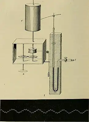 ![]() Ludwig's kymograph. One limb of the manometer is connected to a stylus which writes on the kymograph. Below: kymograph recording | |