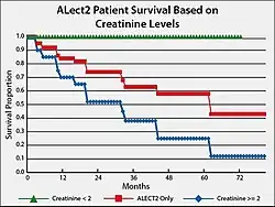 Based on studies conducted in the United States, the prognosis for individuals with ALECT2 is guarded, particularly because they are elderly and their kidney disease is usually well-advanced at the time of presentation.[17] End-stage renal disease develops in 1 out of 3 patients and has a median renal survival of 62 months.[10] A suggested prognostic tool is to track creatinine levels in ALECT2 patients. The attached Figure gives survival plotss for individuals with LECT2 renal amyloidosis and serum creatinine levels less than 2 mg/100 ml versus 2 mg/100 ml or greater than 2 mg/100 ml. The results show that afflicted individuals with lower creatinine levels have a ~four-fold higher survival rate.