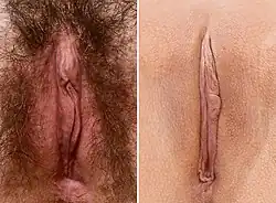 Left: Vulva with pubic hair. Right: Vulva with hair removed by waxing.