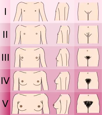 Illustration of the Tanner scale for females, which is a scale for tracking physical changes that occur during puberty. Progression of pubic hair growth can be seen on the right.