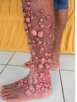 L. loboi is the causative agent of a tropical mycosis, lobomycosis, which is characterized by mucocutaneous lesions, that are usually nodular, vegetating, verrucose, cauliflower-like and hyper- or hypopigmented. Lower extremities and the ears are most commonly involved. Nasal and labial lesions have rarely been reported.[6][4][7][8][9]