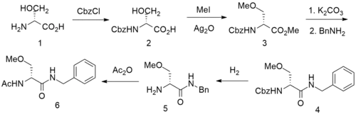 (R)-2-amino-3-hydroxypropanoic acid is treated with acetic anhydride and acetic acid. The product is treated first with N-methylmorpholine, isobutyl chloroformate, and benzylamine, next with methyl iodide and silver oxide, forming lacosamide.[33]
