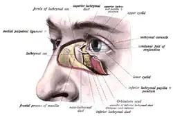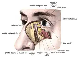 4. Beare, Nicholas A.V.; Bastawrous, Andrew (2014). "Ophthalmology in the Tropics and Sub-tropics". Manson's Tropical Infectious Diseases. Elsevier. pp. 952–994.e1. doi:10.1016/b978-0-7020-5101-2.00068-6. ISBN 978-0-7020-5101-2. Tears drain through the canaliculi, lacrimal sac and naso-lacrimal duct into the nose. Blockage of the naso-lacrimal duct prevents drainage of the lacrimal sac, which may lead to infection, causing a painful swelling at the side of the nose below the medial canthus. This may present as a chronically watery, discharging eye, or as an acutely inflamed abscess. This should be treated with oral broad-spectrum antibiotics. The problem may recur unless drainage into the nose is re-established.