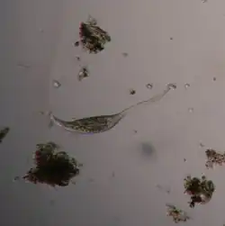 Lacrymaria feed primarily on smaller organisms such as other ciliates, flagellates, and amoeba, but may sometimes tear chunks out of larger ciliates.[2]