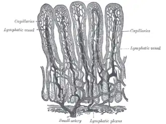 Villi of small intestine, showing bloodvessels and lymphatic vessels.