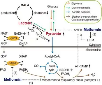 - ↑ DeFronzo, R; Fleming, GA; Chen, K; Bicsak, TA (February 2016). "Metformin-associated lactic acidosis: Current perspectives on causes and risk". Metabolism: Clinical and Experimental. 65 (2): 20–9. doi:10.1016/j.metabol.2015.10.014. PMID 26773926.