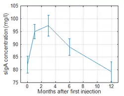 Multiple authors have proposed cellular immunological phenomena as the primary mediators of protective effect of lactobacillus vaccines.[3][45][46] Studies into cellular immunity are technically challenging in humans owing to the difficulty of sampling lymphoid tissues as opposed to secretions, and none has been performed so far on lactobacillus vaccines. A number of studies have been published on the humoral responses to primary and booster immunization in serum[4][15][42][24] and in the vaginal secretions.[47][14][5] Rüttgers identified mucosal secretory IgA as a strong immune correlate of vaccine efficacy.[5]