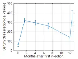 The usual vaccination schedule of Gynatren is 3 intramuscular injections of 0.5 ml vaccine at intervals of 2 weeks, followed by a booster dose of 0.5 ml 6–12 months after the first injection.[39] The booster injection raises the serum antibody titres in most cases back to similar levels to those found shortly after primary vaccination and ensures renewed immune protection for about 2 further years.[39][42] Grčić et al. recommends the periodic administration of booster doses every 2 years to maintain protective immunity for many years.[42]