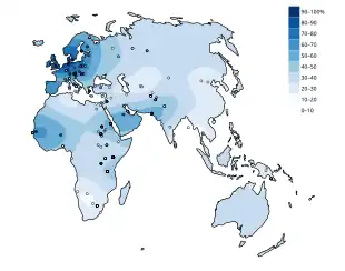 An estimate of the percentage of adults that can digest lactose in the indigenous population of the Old World[70]
