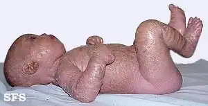 - ↑ 2.0 2.1 2.2 2.3 Van Gysel D, Lijnen RL, Moekti SS, de Laat PC, Oranje AP (September 2002). "Collodion baby: a follow-up study of 17 cases". J Eur Acad Dermatol Venereol. 16 (5): 472–5. doi:10.1046/j.1468-3083.2002.00477.x. PMID 12428840. S2CID 12110995.