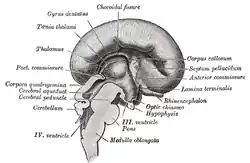 Mesal aspect of a brain sectioned in the median sagittal plane.