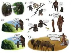 - ↑ Poliva O (2016-06-30). "From Mimicry to Language: A Neuroanatomically Based Evolutionary Model of the Emergence of Vocal Language". Frontiers in Neuroscience. 10: 307. doi:10.3389/fnins.2016.00307. PMC 4928493. PMID 27445676.