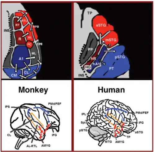 - ↑ Tian B, Reser D, Durham A, Kustov A, Rauschecker JP (April 2001). "Functional specialization in rhesus monkey auditory cortex". Science. 292 (5515): 290–3. Bibcode:2001Sci...292..290T. doi:10.1126/science.1058911. PMID 11303104. S2CID 32846215.