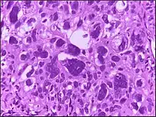 Micrograph showing large cells. H&E stain.