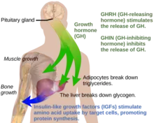 Under normal circumstances in humans, growth hormone (GH) is released in a pulsatile fashion from cells known as somatotrophs in the anterior pituitary gland.[18] These pulses of GH are regulated by cells in the hypothalamus, via the release of growth hormone-releasing hormone (GHRH) into the hypothalamohypophysial system when stimulated by insulin, ghrelin, glucagon, arginine, deep sleep, exercise, fasting, sex hormone release during puberty, and a host of other factors.[18] GH release is inhibited by somatostatin (GHIH), IGF-1, hyperglycemia, and glucocorticoids.[18] Once released, the GH molecules travel through the bloodstream and eventually bind to GH receptors on the surface of cells composing bodily organs and tissues.[18] One major site of action for GH is in the liver, where it stimulates gluconeogenesis and the release of IGF-1 through the JAK-STAT signaling pathway.[18] IGF-1 promotes growth in a variety of tissues throughout the body, especially bone mineralization, and provides negative feedback on GH release.[18] GH results in increased muscle mass, lipolysis, and protein synthesis.[18] Obesity and increased adipose tissue, especially visceral fat, results in reduced GH secretion.[18] There is a natural age-related decline in the GHRH-stimulated release of GH.[18]