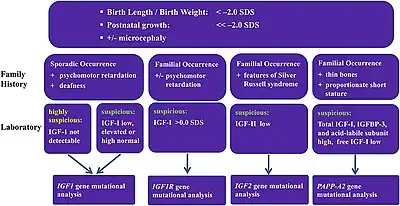 | Differential diagnosis | STAT5b, IGF1 gene mutation, ALS deficiency, IGF-1 receptor mutation, familial short stature, malnutrition, hepatic disease, congenital growth delay, hypopituitarism[1] |