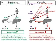 - ↑ 27.0 27.1 Guevara-Aguirre J, Balasubramanian P, Guevara-Aguirre M, Wei M, Madia F, Cheng CW, et al. (2011). "Growth Hormone Receptor Deficiency Is Associated with a Major Reduction in Pro-Aging Signaling, Cancer, and Diabetes in Humans". Science Translational Medicine. 3 (70): 70ra13. doi:10.1126/scitranslmed.3001845. PMC 3357623. PMID 21325617.