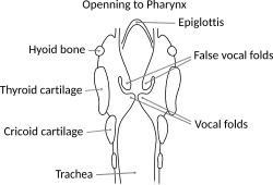 The laryngeal cavity (cavity of the larynx) extends from the laryngeal inlet downwards to the lower border of the cricoid cartilage where it is continuous with that of the trachea.[12][13]