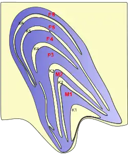 | K: Koniocellular cells (or "interlaminar") | Very small cell bodies | Bistratified cells | color (yellow-blue)[6] | Between each of the M and P layers |