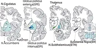 - ↑ Parent, André; Hazrati, Lili-Naz (1995-01-01). "Functional anatomy of the basal ganglia. II. The place of subthalamic nucleus and external pallidium in basal ganglia circuitry". Brain Research Reviews. 20 (1): 128–154. doi:10.1016/0165-0173(94)00008-D. PMID 7711765. S2CID 20808851.