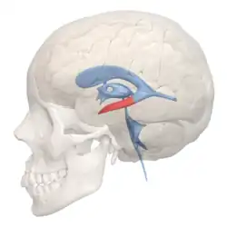 The inferior horn of the lateral ventricle, or temporal horn, is the largest of the horns.[1] It extends anteriorly from the atrium beneath the thalamus and terminates at the amygdala.[1] The collateral eminence and hippocampus form the floor, which is separated from the hippocampus by a white matter layer called the alveus, whereas the roof is formed by the thalamus, the caudate nucleus, and tapetum.[1] The stria terminalis forms the remainder of the roof, which is narrower than at the body, and the choroid plexus occupies the medial wall.[1]