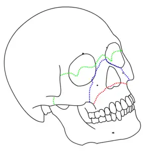 | Le Fort I (red), II (blue), and III (green) fractures | |