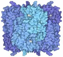 One of the main causes for the pathology of lead is that it interferes with the activity of an essential enzyme called delta-aminolevulinic acid dehydratase, or ALAD (see image of the enzyme structure), which is important in the biosynthesis of heme, the cofactor found in hemoglobin.[150][151][152] Lead also inhibits the enzyme ferrochelatase, another enzyme involved in the formation of heme.[142][153] Ferrochelatase catalyzes the joining of protoporphyrin and Fe2+ to form heme.[142][16][21] Lead's interference with heme synthesis results in production of zinc protoporphyrin and the development of anemia.[154] Another effect of lead's interference with heme synthesis is the buildup of heme precursors, such as aminolevulinic acid, which may be directly or indirectly harmful to neurons.[155] Elevation of aminolevulinic acid results in lead poisoning having symptoms similar to porphyria.[156][157][158][159][160]