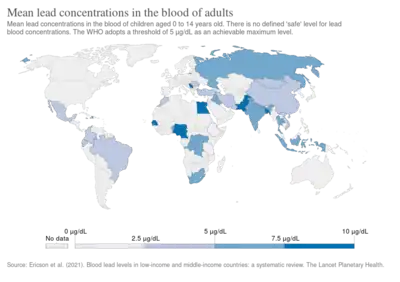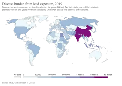 In 2021, lead is believed to have resulted in more than 1.5 million deaths worldwide.[9] In 2019 it was estimated to have killed more than 5 million people secondary to heart disease alone.[1] It occurs most commonly in the developing world.[3] Those who are poor are at greater risk.[3] Lead is believed to result in 0.6% of the world's disease burden.[6] People have been mining and using lead for thousands of years.[5] Descriptions of lead poisoning date to at least 2000 BC,[5] while efforts to limit lead's use date back to at least the 16th century.[6] Concerns for low levels of exposure begin in the 1970s with there being no safe threshold for lead exposure.[3][5]