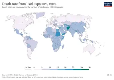 - ↑ "Notes from the Field: Severe Environmental Contamination and Elevated Blood Lead Levels Among Children — Zambia, 2014". www.cdc.gov. Archived from the original on 2016-03-02. Retrieved 2016-02-19.