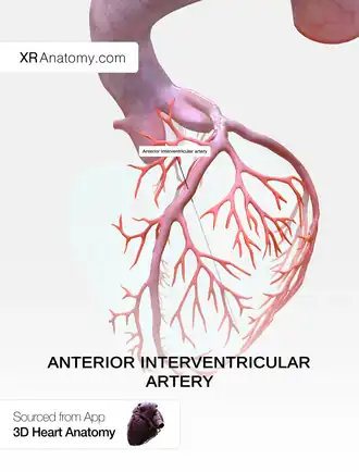 The left anterior descending artery (LAD, or anterior descending branch), also called anterior interventricular artery (IVA, or anterior interventricular branch of left coronary artery)[1] is a branch of the left coronary artery. It supplies the anterior portion of the left ventricle.[2] It provides about half of the arterial supply to the left ventricle and is thus considered the most important vessel supplying the left ventricle. Blockage of this artery is often called the widow-maker infarction due to a high risk of death.[3]