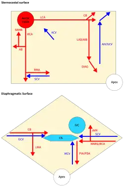 ![]() ARTERIES: RCA = right coronary AB = atrial branches SANB = sinuatrial nodal RMA = right marginal LCA = left coronary CB = circumflex branch LAD/AIB = anterior interventricular LMA = left marginal PIA/PDA = posterior descending AVN = atrioventricular nodal VEINS: SCV = small cardiac ACV = anterior cardiac AIV/GCV = great cardiac MCV = middle cardiac CS = coronary sinus | |