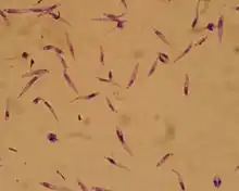 Leishmania major is a species of parasite found in the genus Leishmania, and is associated with the disease zoonotic cutaneous leishmaniasis (also known as Aleppo boil, Baghdad boil, Bay sore, Biskra button, Chiclero ulcer, Delhi boil, Kandahar sore, Lahore sore, Oriental sore, Pian bois, and Uta).[1] L. major is an intracellular pathogen which infects the macrophages and dendritic cells of the immune system.[2] Though Leishmania species are found on every continent aside from Antarctica, Leishmania major is found only in the Eastern Hemisphere, specifically in Northern Africa,[3] the Middle East, Northwestern China, and Northwestern India.[4][5]