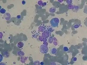 Leishmaniasis is diagnosed in the hematology laboratory by direct visualization of the amastigotes (Leishman–Donovan bodies). Buffy-coat preparations of peripheral blood or aspirates from marrow, spleen, lymph nodes, or skin lesions should be spread on a slide to make a thin smear and stained with Leishman stain or Giemsa stain (pH 7.2) for 20 minutes. Amastigotes are seen within blood and spleen monocytes or, less commonly, in circulating neutrophils and in aspirated tissue macrophages. They are small, round bodies 2–4 μm in diameter with indistinct cytoplasm, a nucleus, and a small, rod-shaped kinetoplast. Occasionally, amastigotes may be seen lying free between cells.[23] However, the retrieval of tissue samples is often painful for the person and identification of the infected cells can be difficult; therefore other indirect immunological methods of diagnosis are developed, including enzyme-linked immunosorbent assay, antigen-coated dipsticks, and direct agglutination test (although these tests are readily available, they are not the standard diagnostic tests due to their insufficient sensitivity and specificity).