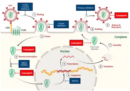 - ↑ Dzinamarira, Tafadzwa; Almehmadi, Mazen; Alsaiari, Ahad Amer; Allahyani, Mamdouh; Aljuaid, Abdulelah; Alsharif, Abdulaziz; Khan, Abida; Kamal, Mehnaz; Rabaan, Ali A.; Alfaraj, Amal H.; AlShehail, Bashayer M.; Alotaibi, Nouf; AlShehail, Shams M.; Imran, Mohd (28 May 2023). "Highlights on the Development, Related Patents, and Prospects of Lenacapavir: The First-in-Class HIV-1 Capsid Inhibitor for the Treatment of Multi-Drug-Resistant HIV-1 Infection". Medicina (Kaunas, Lithuania). 59 (6): 1041. doi:10.3390/medicina59061041. ISSN 1648-9144. Archived from the original on 22 May 2024. Retrieved 4 August 2024.