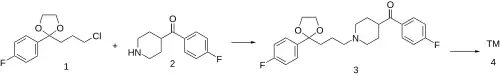 The alkylation between 2-(3-chloropropyl)-2-(4-fluorophenyl)-1,3-dioxolane [3308-94-9] (1) and 4-(4-fluorobenzoyl)piperidine [56346-57-7] (2) gives 2-(p-fluorophenyl)-2-{3-[4-(p-fluorobenzoyl)piperidino]propyl}-1,3-dioxolane, CID:20318874 (3). Deprotection of the ketal function completes the synthesis of lenperone (4).