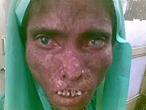 This debilitating form of leprosy begins to spread causing the eyebrows to disappear and spongy tumor like swellings appear on the face and body. The disease attacks the internal organs, bones, joints and marrow of the body resulting in physical degeneration. The result is deformity with loss of feeling in the fingers and toes which eventually fall off. Contrary to popular belief, both forms of leprosy are curable, with the lepromatous form classically treated with antibiotics dapsone, rifampin and clofazimine for as long as 2–5 years, but if left untreated the person may die up to 20 or 30 years from its inception.[4]