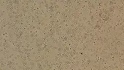 Leuconostoc mesenteroides is a species of lactic acid bacteria associated with fermentation, under conditions of salinity and low temperatures (such as lactic acid production in fermented sausages).[2] In some cases of vegetable and food storage, it was associated with pathogenicity (soft rot, slime and unpleasant odor).[3] L. mesenteroides is approximately 0.5-0.7 μm in diameter and has a length of 0.7-1.2 μm,[2] producing small grayish colonies that are typically less than 1.0 mm in diameter. It is facultatively anaerobic, Gram-positive, non-motile, non-sporogenous, and spherical. It often forms lenticular coccoid cells in pairs and chains, however, it can occasionally form short rods with rounded ends in long chains, as its shape can differ depending on what media the species is grown on.[2][3] L. mesenteroides grows best at 30 °C, but can survive in temperatures ranging from 10 °C to 30 °C. Its optimum pH is 5.5, but can still show growth in pH of 4.5-7.0.[3]