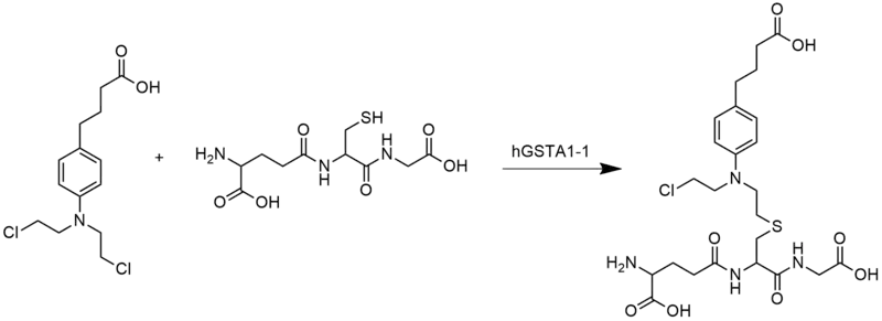 Shown above, chlorambucil reacts with glutathione as catalyzed by hGSTA 1-1 leading to the formation of the monoglutathionyl derivative of chlorambucil.
