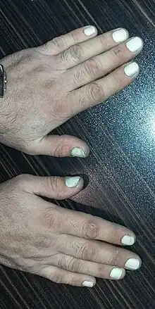 Leukonychia striata, transverse leukonychia, or Mees' lines are a whitening or discoloration of the nail in bands or "stria" that run parallel the lunula (nail base). This is commonly caused by physical injury or disruption of the nail matrix. Common examples include excessive biting or tapping of the nails, trauma or injury from accidents involving doors or windows, and extensive use of manicure.[8] It may also occur in great toenails as a result of trauma from footwear. Alternatively, the condition can be caused by heavy metal poisoning, most commonly by lead.[9] Finally, it can be caused by cirrhosis of the liver or chemotherapy.[10]