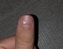 It is harmless and most commonly caused by minor injuries, such as nail biting, which occur while the nail is growing.[14] Leukonychia occurs most commonly in healthy individuals, and is unrelated to any known nutritional or physiological deficiency.[7] When caused by injury the marks will disappear as the nail grows outwards. While there are various sources that link dietary needs or vitamin deficiency with recurrent leukonychia,[15][16] this notion has been challenged by some medical researchers.[17]