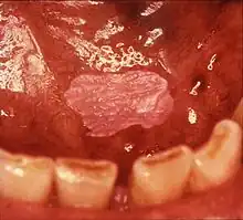 Leukoplakia is a white patch on a inside of the mouth, which cannot be rubbed off.[8] It is associated with an increased risk of cancer.[4][5] The edges of the lesion are typically abrupt and the lesion changes with time.[4][6] Advanced forms may develop red patches.[6] There are generally no other symptoms.[9] It usually occurs within the mouth, although sometimes mucosa in other parts of the gastrointestinal tract, urinary tract, or genitals may be affected.[10][11][12]