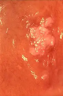 Leukoplakia could be classified as mucosal disease, and also as a premalignant condition. Although the white color in leukoplakia is a result of hyperkeratosis (or acanthosis), similarly appearing white lesions that are caused by reactive keratosis (smoker's keratosis or frictional keratoses e.g. morsicatio buccarum) are not considered to be leukoplakias.[15] Leukoplakia could also be considered according to the affected site, e.g. oral leukoplakia, leukoplakia of the urinary tract, including bladder leukoplakia or leukoplakia of the penis, vulvae, cervix or vagina.[16][17] Leukoplakia may also occur in the larynx, possibly in association with gastro-esophageal reflux disease.[18] Oropharyngeal leukoplakia is linked to the development of esophageal squamous cell carcinoma,[18] and sometimes this is associated with tylosis, which is thickening of the skin on the palms and soles of the feet (see: Leukoplakia with tylosis and esophageal carcinoma). Dyskeratosis congenita may be associated with leukoplakia of the oral mucosa and of the anal mucosa.[18]