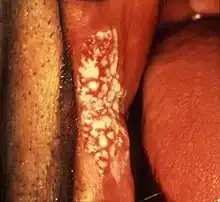 Differential diagnosisYeast infection, lichen planus, keratosis due to repeated minor trauma[4]