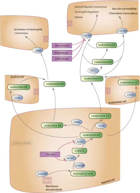 - ↑ "Mechanism of action of leukotriene modifiers". PharmGKB.
